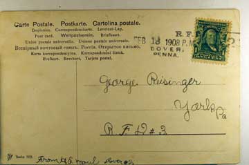 Card # 16498. View Larger | Rotate R.F.D. Dover, Pennsylvania 1908 Cancel on Postcard DB F