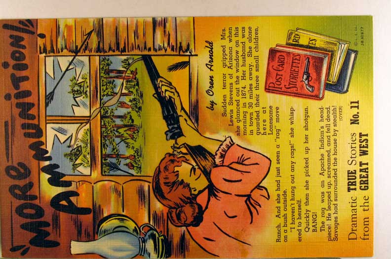 Card # 592. View Larger | Rotate Post Card Storiettes, Curt Teich pub. Dramatic True Stories From The Great West, # 11, “More Ammunition” L VF