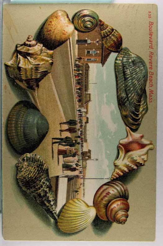 Card # 176313. View Larger | Rotate Shell Border, “Boulevard, Revere Beach, Mass.”, Used 1907 DB emb m cof & m edge st Near F-VF
