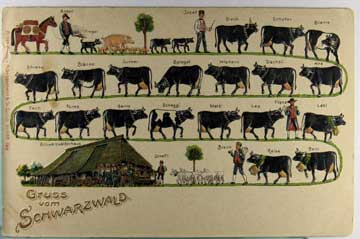 Card # 195428. View Larger | Rotate Winder, Gruss vom Schwarzwald w/ Cows, Used 1908 DB emb cor crs Near F-VF