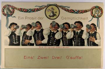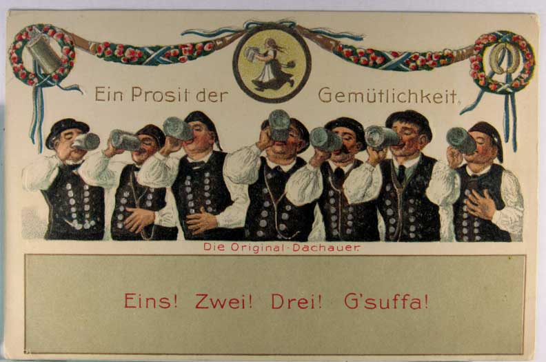 Card # 164681. View Larger | Rotate Guggenheim Pub., Beer Drinking Comic, “Eins! Zwei! Drei! G’suffa!” DB emb VF