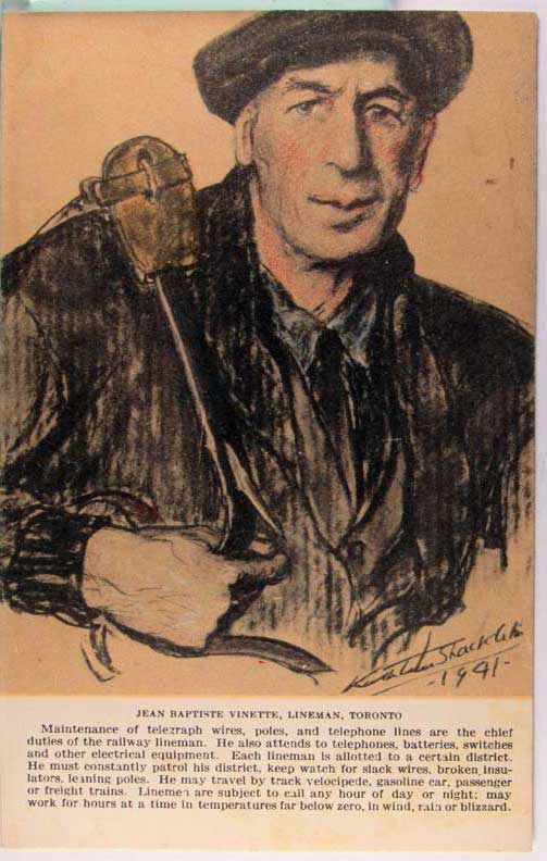 Card # 187105. View Larger | Rotate Canadian Pacific Railway Ser., “Jean Baptiste Vinette, Lineman”, Art. Sig. 1940 VF