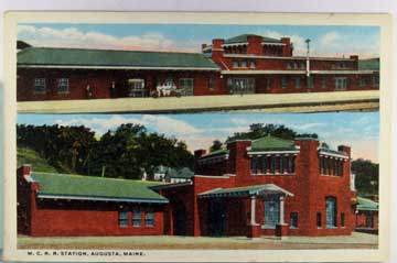 Card # 172841. View Larger | Rotate Train Depot, Augusta, Maine, Printed Tinted Printed Photo, Curt Teich Pub. WB m cor wear VF