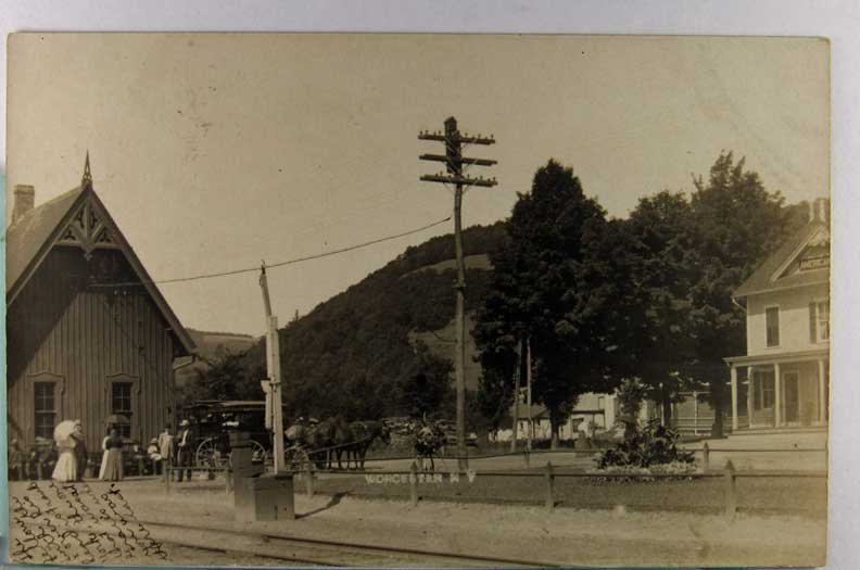 Card # 175003. View Larger | Rotate Train Depot, Real Photo, Worcester, New York m wof & cor album marks Near F-VF