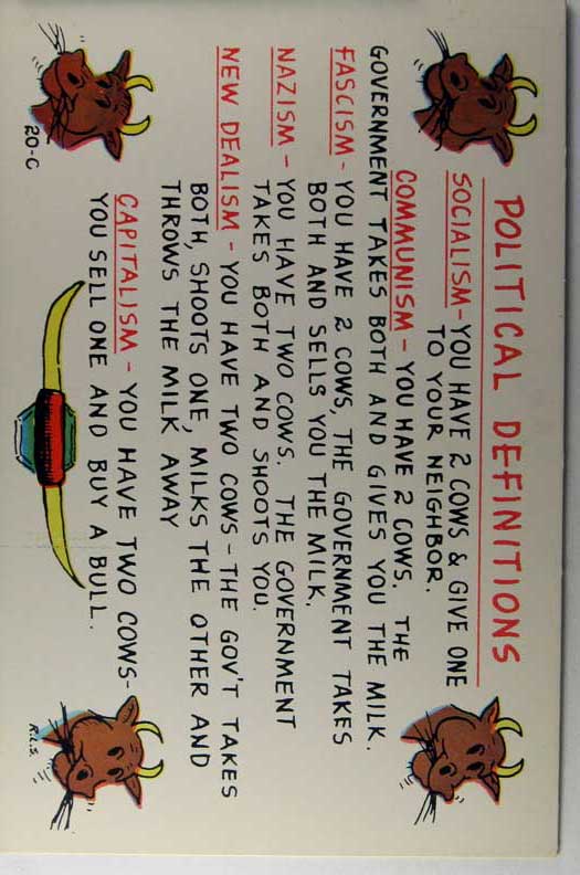 Card # 150753. View Larger | Rotate Political Definitions Comic w/ Communism, Fascism, Nazism etc. Explained using Cows pub. in Texas pre zip code C VF
