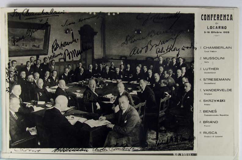 Card # 123419. View Larger | Rotate Real Photo of “Conferenza di Locarno 1925” w/ Chamberlain & Mussolini, Reproduced Signatures m cor wear F-VF