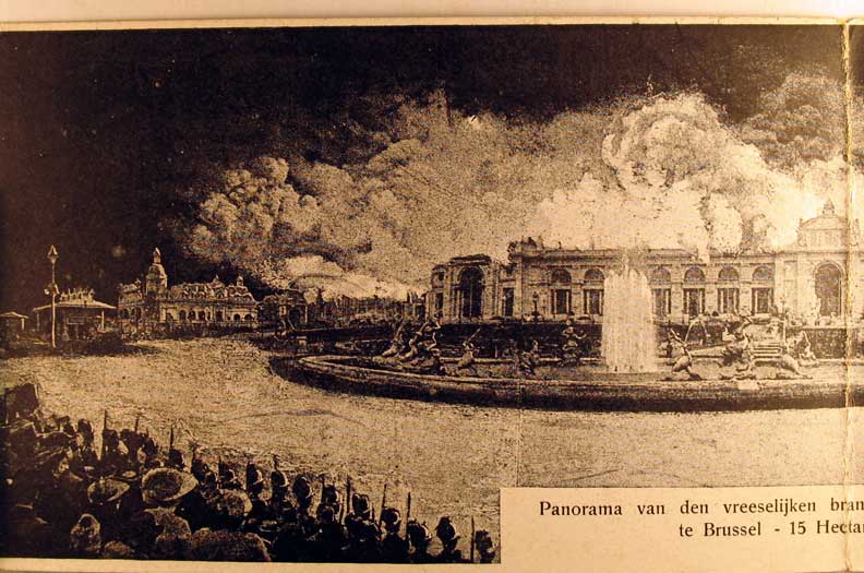 Card # 18992. View Larger | Rotate Belgium, Double Card w/ Panoramic View of Wereldtentoonstelling in Brussel, Huge Fire, B&W DB F-VF
