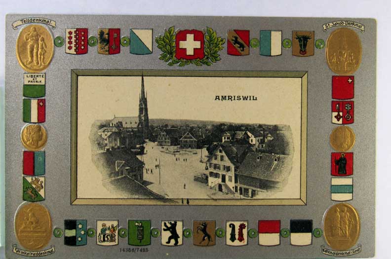 Card # 138958. View Larger | Rotate Switzerland, Amriswil w/ Crests & Printed View, Guggeinheim Pub. DB emb VF
