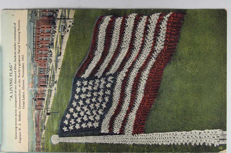 Card # 121565. View Larger | Rotate W.W. I, U.S. Patriotic w/ “A Living Flag”, Naval Training Center, Great Lakes, Illinois cpr. 1917 Near VF