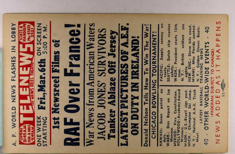 Card # 187705. View Larger | Rotate W.W. II, U.S. Pub., War News Reel Chicago, Theater Adv., “Telenews”, Fri., Mar. 6th VF